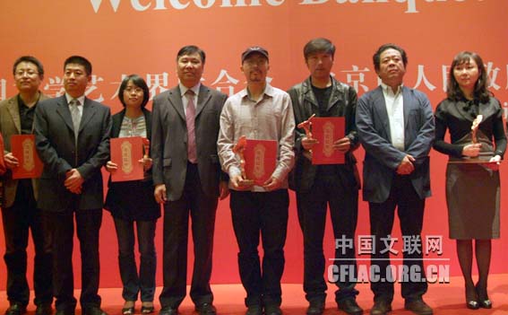 9月20日晚,第四届中国北京国际美术双年展颁奖仪式暨中国中青年美术家海外研修工程派遣仪式在京举行。图为领导与获颁2010年度中国中青年美术家海外研修工程派遣证书的艺术家合影。中国文联网 云菲 摄