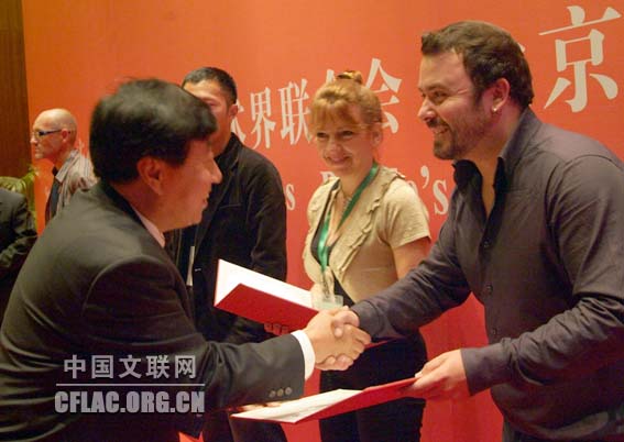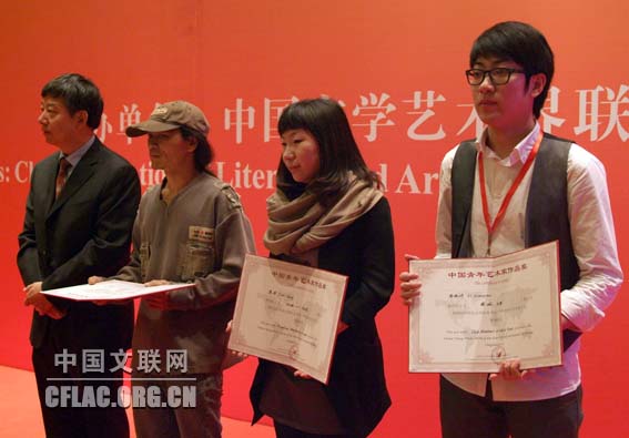 9月20日晚,第四届中国北京国际美术双年展颁奖仪式暨中国中青年美术家海外研修工程派遣仪式在京举行。图为中国文联副主席、中国美协主席刘大为向获奖者颁奖。中国文联网 云菲 摄