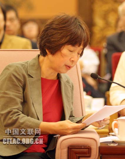 9月24日,由文化部、中国文联、北京市人民政府共同举办的纪念曹禺诞辰100周年座谈会在北京人民大会堂隆重举行。图为曹禺先生的女儿万方在座谈会上发言。中国文联网 彭宽 摄
