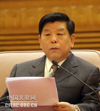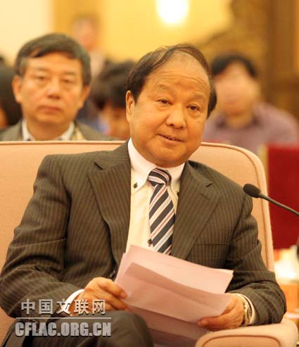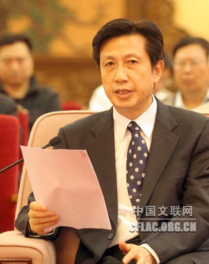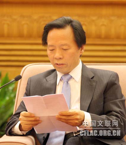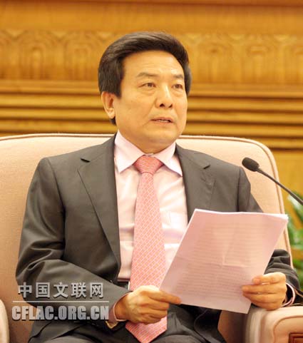 9月24日,由文化部、中国文联、北京市人民政府共同举办的纪念曹禺诞辰100周年座谈会在北京人民大会堂隆重举行。图为北京市委常委、宣传部部长、副市长蔡赴朝在座谈会上发言。中国文联网 彭宽 摄