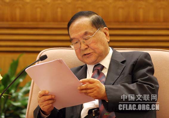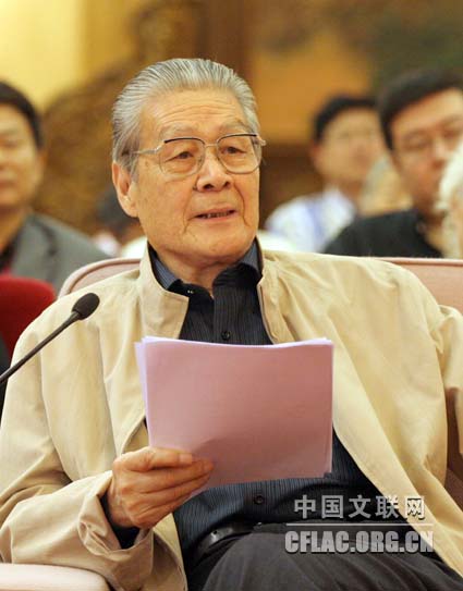 9月24日,由文化部、中国文联、北京市人民政府共同举办的纪念曹禺诞辰100周年座谈会在北京人民大会堂隆重举行。图为中国文联名誉主席周巍峙在座谈会上发言。中国文联网 彭宽 摄