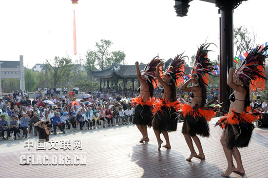 10月7日晚,由中国文联和江苏省人民政府共同主办,江苏省文化厅、江苏省文联、苏州市人民政府联合承办的第八届中国国际民间艺术节,在苏州工业园区科技文化艺术中心隆重开幕。艺术节期间,来自世界五大洲14个国家的1200多名中外艺术家,在江苏苏州5市7区,采用舞台演出和即兴展示相结合的方式进行巡回展演。图为10月8日,库克群岛启明星舞蹈团在苏州市吴中区甪直镇江南文化园广场为当地百姓演出《草裙舞》。中国文联网 余宁 摄