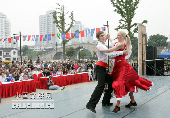 10月7日晚,由中国文联和江苏省人民政府共同主办,江苏省文化厅、江苏省文联、苏州市人民政府联合承办的第八届中国国际民间艺术节,在苏州工业园区科技文化艺术中心隆重开幕。艺术节期间,来自世界五大洲14个国家的1200多名中外艺术家,在江苏苏州5市7区,采用舞台演出和即兴展示相结合的方式进行巡回展演。图为10月9日,来自俄罗斯的艺术家们在古胥门广场为苏州市民进行表演,受到大家的热烈欢迎。中国文联网 余宁 摄
