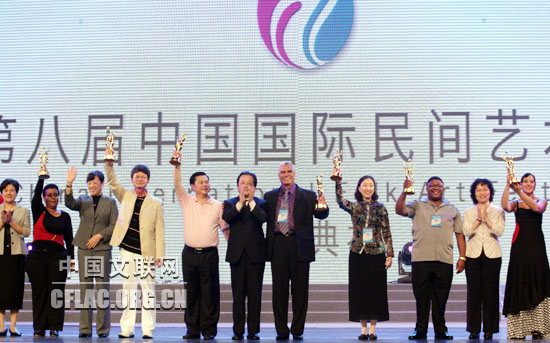 10月12日,第八届中国国际民间艺术节颁奖典礼暨中外艺术家大联欢在苏州市相城区体育艺术馆举行。图为冯远等领导为参演的各国艺术团颁奖。中国文联网 孟祥宁 摄