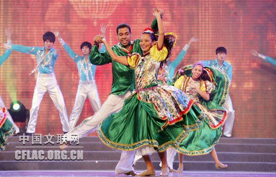 10月12日,第八届中国国际民间艺术节颁奖典礼暨中外艺术家大联欢在苏州市相城区体育艺术馆举行。图为巴西北大河州联邦大学民间舞团演出《桑巴与肖特》。中国文联网 孟祥宁 摄