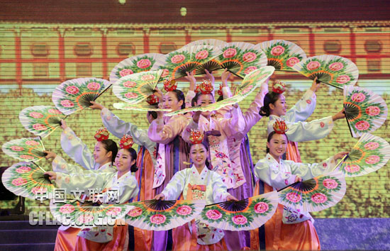 10月12日,第八届中国国际民间艺术节颁奖典礼暨中外艺术家大联欢在苏州市相城区体育艺术馆举行。图为韩国全银子舞蹈团演出《花扇舞》。中国文联网 孟祥宁 摄