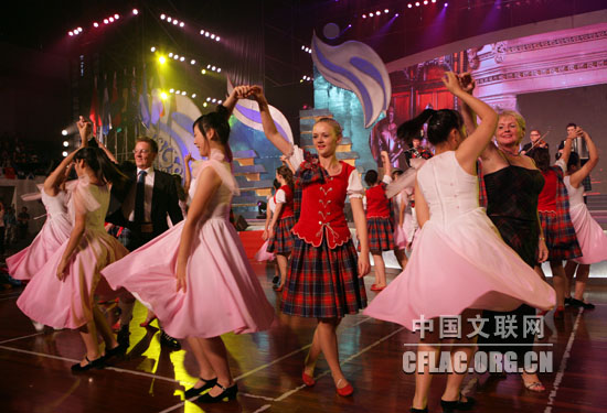10月12日,第八届中国国际民间艺术节颁奖典礼暨中外艺术家大联欢在苏州市相城区体育艺术馆举行。图为英国苏格兰戈登舞蹈学校艺术团演员与中国演员互动演出。中国文联网 孟祥宁 摄
