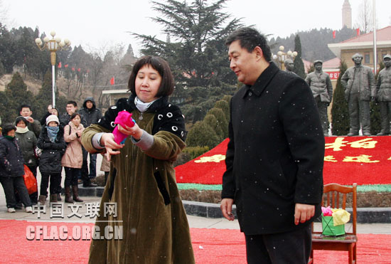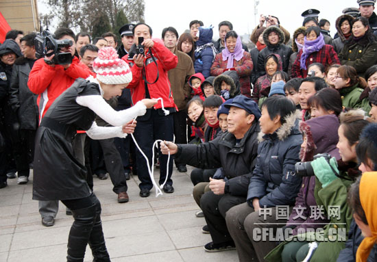 12月22日,中国文联、中国杂协、中国民协“送欢乐、下基层”慰问演出团一行赶赴河北平山县西柏坡。当天晚上,演员们在西柏坡平山会堂为群众带来了精彩演出。第二天一早,慰问演出团小分队的艺术家们不顾旅途奔波和演出劳累,又匆匆赶往西柏坡纪念馆广场进行慰问演出。图为杂技演员李军岭与群众互动演出。中国文联网 李亮 摄