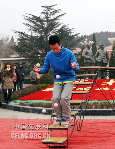 12月22日,中国文联、中国杂协、中国民协“送欢乐、下基层”慰问演出团一行赶赴河北平山县西柏坡。当天晚上,演员们在西柏坡平山会堂为群众带来了精彩演出。第二天一早,慰问演出团小分队的艺术家们不顾旅途奔波和演出劳累,又匆匆赶往西柏坡纪念馆广场进行慰问演出。图为中国杂技团有限公司演员曹凯表演《球技》。中国文联网 李亮 摄