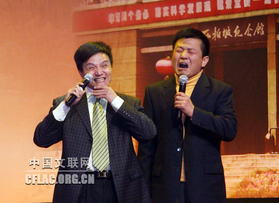 12月22日,中国文联、中国杂协、中国民协“送欢乐、下基层”慰问演出团一行赶赴河北平山县西柏坡。当天晚上,演员们在西柏坡平山会堂为群众带来了精彩演出。图为李伟健、武宾表演相声《彩铃声声》。中国文联网 李亮 摄