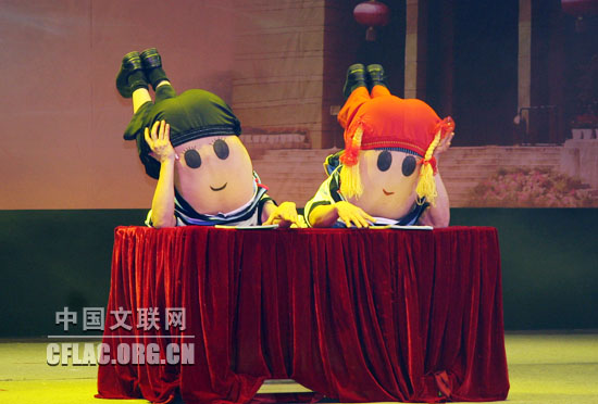 12月22日,中国文联、中国杂协、中国民协“送欢乐、下基层”慰问演出团一行赶赴河北平山县西柏坡。当天晚上,演员们在西柏坡平山会堂为群众带来了精彩演出。图为刘全和、刘全利表演滑稽节目《快乐童年》。中国文联网 李亮 摄