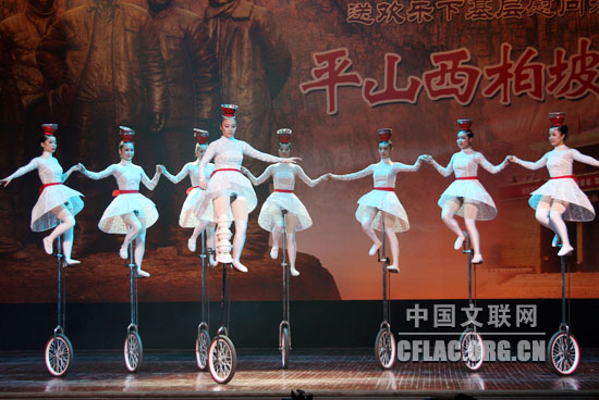 12月22日,中国文联、中国杂协、中国民协“送欢乐、下基层”慰问演出团一行赶赴河北平山县西柏坡。当天晚上,演员们在西柏坡平山会堂为群众带来了精彩演出。图为广州军区战士杂技团表演《耀——高车踢碗》。中国文联网 李亮 摄