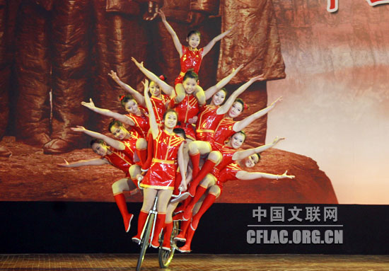 12月22日,中国文联、中国杂协、中国民协“送欢乐、下基层”慰问演出团一行赶赴河北平山县西柏坡。当天晚上,演员们在西柏坡平山会堂为群众带来了精彩演出。图为河北省杂技团表演《雏凤凌空——集体车技》。中国文联网 李亮 摄