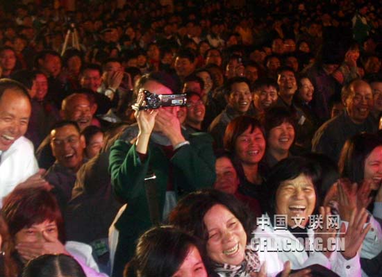 12月29日晚,中国文联、中国曲协“送欢乐、下基层”慰问团到福建省南安市武荣公园为当地群众演出。图为观众用摄影机记录这开心一刻。中国文联网 李亮 摄
