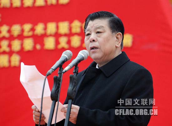 图为中国文联党组书记、副主席胡振民在慰问演出前讲话。中国文联网 孟祥宁 摄