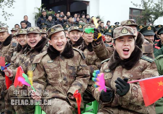 1月7日至8日,由中国文联、贵州省委宣传部主办的中国文联“送欢乐、下基层”赴遵义革命老区慰问活动举行。图为精彩演出受到官兵们的热烈欢迎。中国文联网 孟祥宁、郭青剑 摄