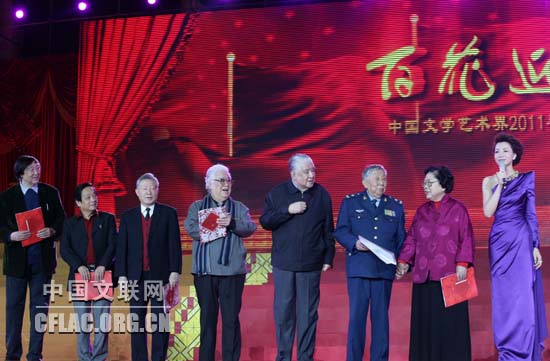 1月16日,由中国文联主办的“百花迎春——中国文学艺术界2011春节大联欢”在北京人民大会堂隆重举行。图为王昆、阎肃、李默然、于洋、傅庚辰、韩美林、冯骥才等老艺术家发表新春感言。中国文联网 孟祥宁 摄