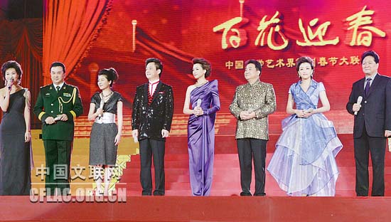 1月16日,由中国文联主办的“百花迎春——中国文学艺术界2011春节大联欢”在北京人民大会堂隆重举行。图为强大的主持人阵容。中国文联网 孟祥宁 摄