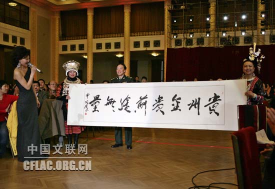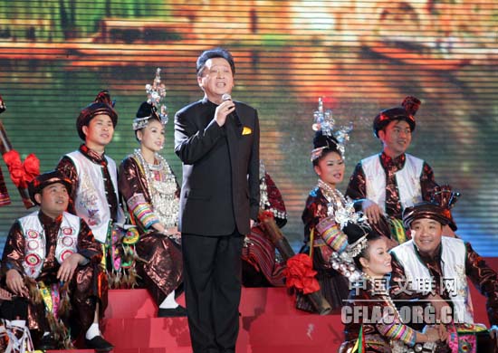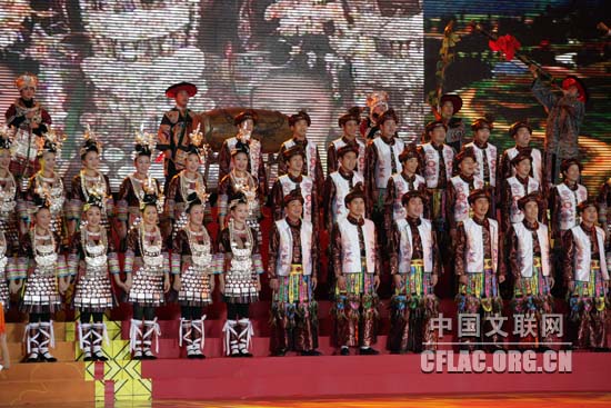 1月16日下午,北京人民大会堂大宴会厅张灯结彩,喜气洋洋,由中国文联主办的“百花迎春——中国文学艺术界2011春节大联欢”在这里隆重举行。图为黔东南青年演唱侗歌《迎春花开红军来》。中国文联网 孟祥宁 摄