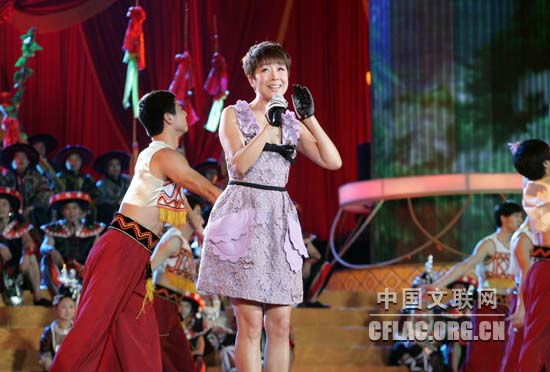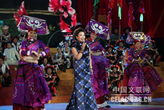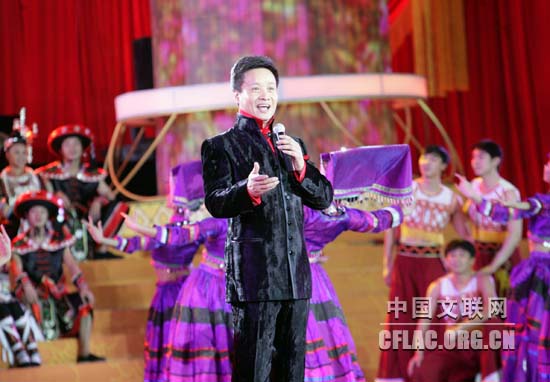 1月16日下午,北京人民大会堂大宴会厅张灯结彩,喜气洋洋,由中国文联主办的“百花迎春——中国文学艺术界2011春节大联欢”在这里隆重举行。图为张也精彩演绎《贵州恋歌》。中国文联网 李亮 摄