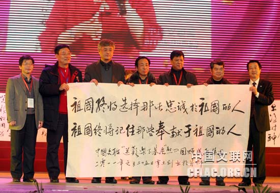 1月24日至26日,中国文联组织艺术家赴四川“送欢乐、下基层”。图为书法家赠送书法作品。中国文联网 彭宽 摄