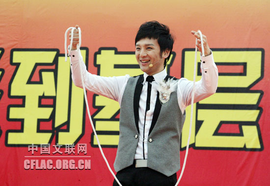 2月26日上午,由中国文联、中国艺术报社组织的“送欢乐、下基层”文艺家慰问演出团为蔚县40多万人民带来了一场精彩的文艺演出。图为傅琰东表演魔术。中国文联网 彭宽 摄