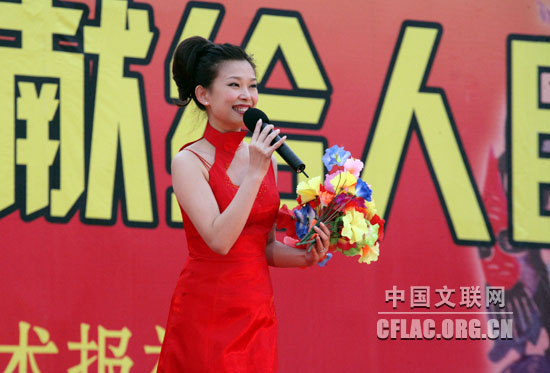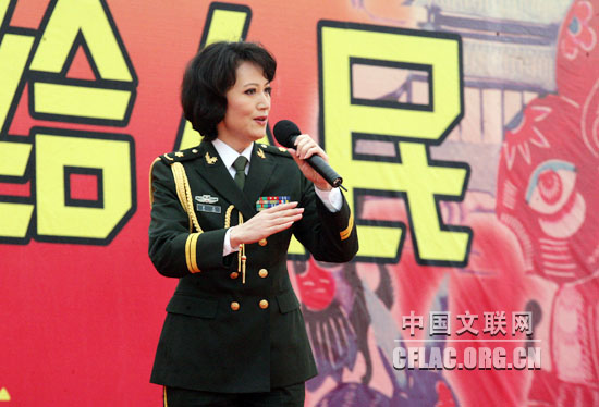 2月26日上午,由中国文联、中国艺术报社组织的“送欢乐、下基层”文艺家慰问演出团为蔚县40多万人民带来了一场精彩的文艺演出。图为张华丽演唱《美丽的心情》。中国文联网 彭宽 摄