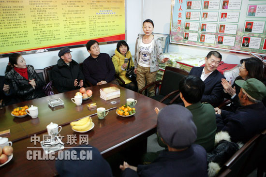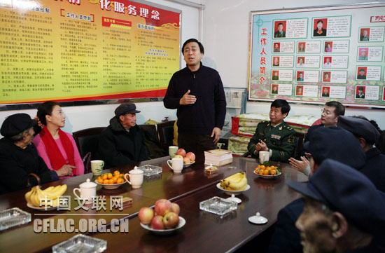 2月25日至26日,中国文联、中国艺术报社组织文艺家赴蔚县“送欢乐、下基层”。2月25日,文艺家们从北京出发,经过5个多小时的长途跋涉,于当天下午赶到蔚县,来不及喘口气,就组成小分队直奔蔚县光荣院。图为文艺家们向蔚县光荣院年过7旬的“老革命”表达了敬意并献上了精彩的节目。中国文联网 彭宽 摄