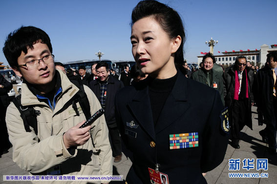 2011年3月3日,全国政协十一届四次会议在北京人民大会堂开幕。图为宋祖英接受记者采访。新华网 孙巍 摄
