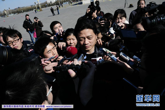 2011年3月3日,全国政协十一届四次会议在北京人民大会堂开幕。图为全国政协委员濮存昕接受记者采访。新华网 孙巍 摄 |