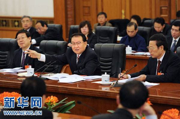 3月7日,中共中央政治局常委李长春参加十一届全国人大四次会议天津代表团审议。 新华社记者 李涛 摄