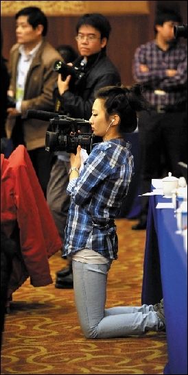 干练的女摄像记者拍摄别人的同时,也成为被拍摄的对象。