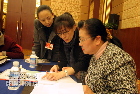 3月7日,邰丽华委员邀请苏国璋委员联名提案。中国文联网 彭宽 摄