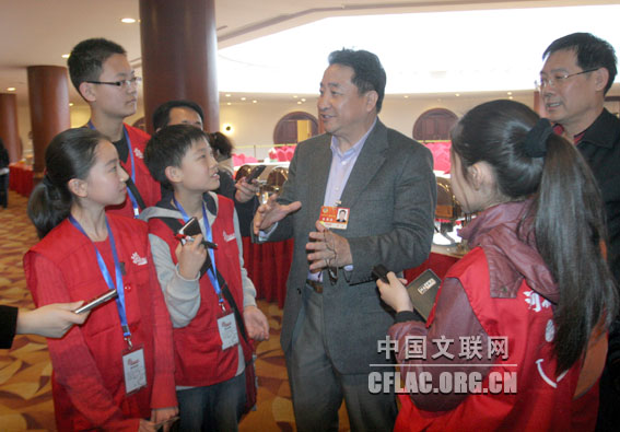 3月7日,姜昆委员接受“小记者”采访。中国文联网 彭宽 摄