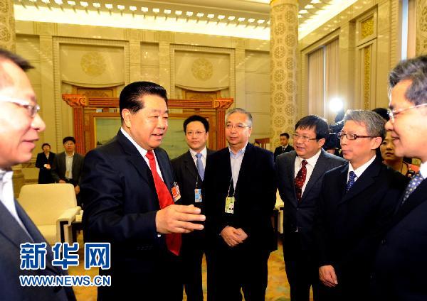 3月13日,中国人民政治协商会议第十一届全国委员会第四次会议在北京人民大会堂闭幕。闭幕式结束后,中共中央政治局常委、全国政协主席贾庆林看望了参加两会新闻报道工作的中央新闻单位负责人。新华社记者 李学仁摄