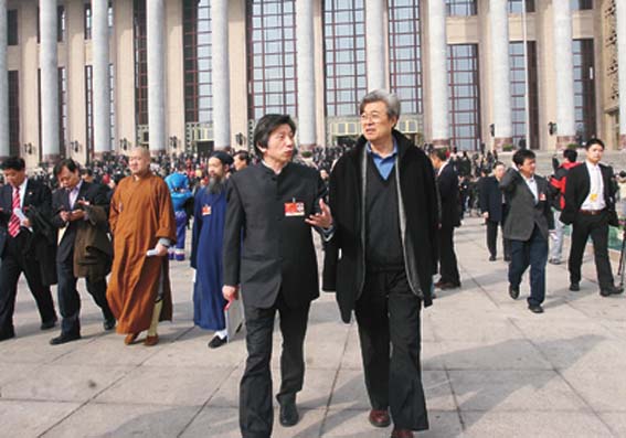 3月13日,全国政协十一届四次会议在北京人民大会堂胜利闭幕。会议期间,与会文艺界政协委员积极参政议政,为“十二五”规划和实现文艺事业的更大繁荣积极建言献策。图为文艺界政协委员在闭幕会结束后走出人民大会堂,畅谈“十二五”的美好前景。中国文联网 郭青剑 摄