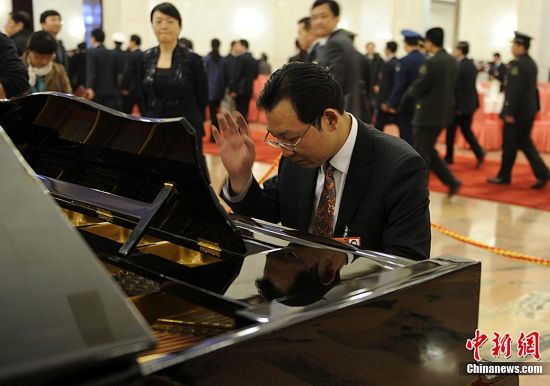 3月11日,十一届全国人大四次会议举行第三次全体大会,出席会议的云南昭通市市长王敏正在会议结束后弹奏起人民大会堂中央大厅摆放的世界最大钢琴。中新社发 廖攀 摄