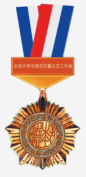 奖章设计说明:奖章以闪闪发光的五角星为外轮廓,仿佛又像是一朵盛开的鲜花。花蕊由篆书“德艺”二字构成,笔画依圆造型,具有中国传统篆刻印章的古朴韵味。四周再辅以花纹装饰图案,增强了视觉效果,该图案取材于贵州中南部苗族女子服饰上的花边纹样,借鲜花来象征“百花齐放”的文艺方针。