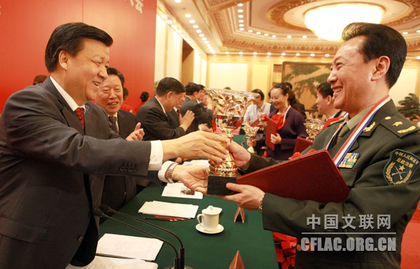6月20日,由中宣部、人力资源和社会保障部、中国文联共同主办的第三届全国中青年德艺双馨文艺工作者表彰大会在京召开。图为中共中央政治局委员、中央书记处书记、中宣部部长刘云山为获表彰文艺工作者颁发证书、奖牌和奖杯。中国文联网 余宁 摄