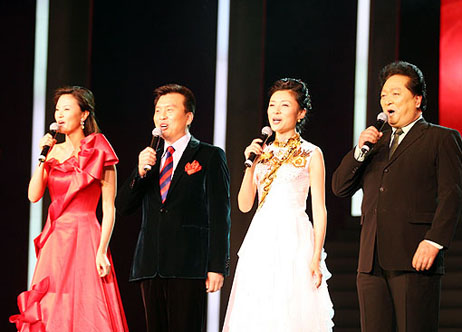 瞿弦和、周涛、张泽群和刘芳菲主持节目(从左至右)。中国文联网 余宁 摄