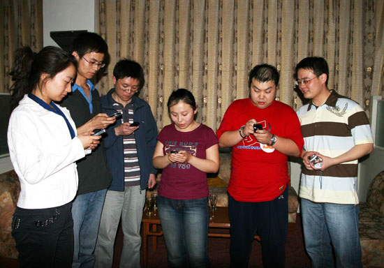 团员们用手机发送捐款短信为灾区人民献爱心