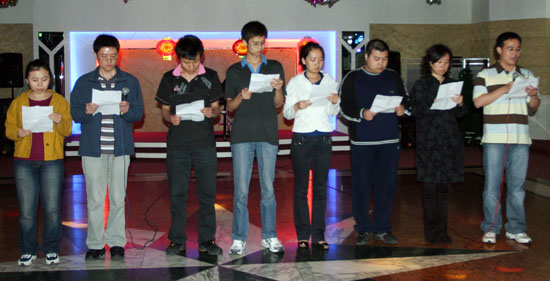 在“让世界充满爱”主题活动中,中国艺术报社的团员们将排练好的小合唱临时改为诗朗诵《挺起民族的脊梁》,表达了中华民族众志成城抗震救灾的坚强决心。
