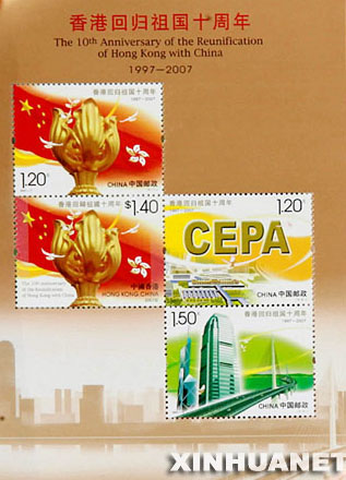 1日上午,中国邮政集团公司和香港邮政署在深圳市少年宫举行《香港回归祖国十周年》邮票首发仪式,纪念香港回归祖国十周年。