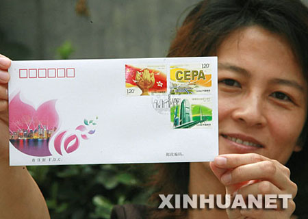 中国邮政将于7月1日发行《香港回归祖国十周年》纪念邮票1套3枚。这是6月28日,工作人员在展示《香港回归祖国十周年》纪念邮票首日封。新华社记者汪永基摄