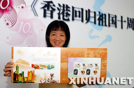 6月28日,工作人员在《香港回归祖国十周年》纪念邮票发布会上展示中国邮政定于2007年7月1日发行的这套邮票。