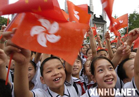 7月1日,小学生在集会上挥舞旗帜。当日傍晚,南京各界群众千余人在南京静海寺举行集会和撞钟仪式,庆祝香港回归十周年。新华社记者 孙参摄