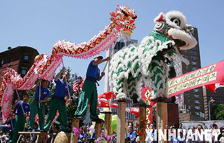 6月30日,在纽约唐人街举行的庆祝香港回归十周年活动中,舞龙舞狮队在表演“龙狮同舞”。当日,美东华人社团联合总会在纽约唐人街举行香港回归十周年庆祝活动,舞龙、舞狮、鼓乐等表演吸引了众多华人华侨到场同庆。 新华社记者侯俊摄