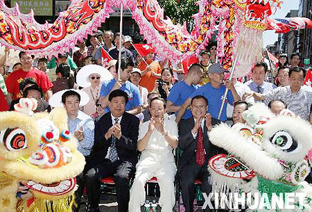 6月30日,在纽约唐人街举行的庆祝香港回归十周年活动中,中国常驻联合国代表王光亚(前排中)等为舞狮表演鼓掌。当日,美东华人社团联合总会在纽约唐人街举行香港回归十周年庆祝活动,舞龙、舞狮、鼓乐等表演吸引了众多华人华侨到场同庆。 新华社记者侯俊摄