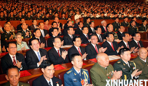 人民大会堂大礼堂华灯璀璨,舞台幕布上“八一”军徽熠熠闪光,台口前三军礼兵威武伫立。晚上近8时,胡锦涛等领导同志步入晚会现场,全场响起了热烈的掌声。