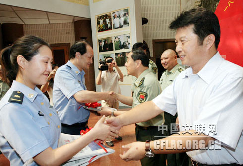 覃志刚在赠送仪式上致词。覃志刚说,《中国艺术报》是中国文联主办的全国性艺术专业大报,是广大文艺工作者自己的报纸,也是军旅艺术家的园地。这次《中国艺术报》在总政宣传部的大力支持下,推出了80个版的庆祝建军80周年特刊,比较全面地梳理了军旅文艺的历史,展现了著名军旅艺术家的风采,反映了军旅文艺的风貌,报道了丰富多彩的建军80周年纪念活动。这是中国文联和《中国艺术报》献给建军80周年、献给人民解放军广大指战员的一份特殊礼物。他指出,中国文联与我们人民军队一直有着深厚的鱼水情谊。中国文联全国委员会委员里,有许多来自部队的代表;中国文联所属各全国文艺家协会的会员,都有来自军队的精兵强将。军队文艺工作者是我国文艺大军中的一支重要力量。中国文联历年来举办的各种活动,更是得到了部队各文艺院团和广大军旅文艺家的倾力相助和大力支持。可以这样说,军队的支持是中国文联各项活动能够顺利开展的重要保证之一。